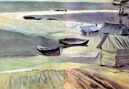 Тут, на косе, умещается дом Казиса, огород, ещё несколько домов с огородами. А на берегу много лодок. Это лодки рыболовецкого колхоза.