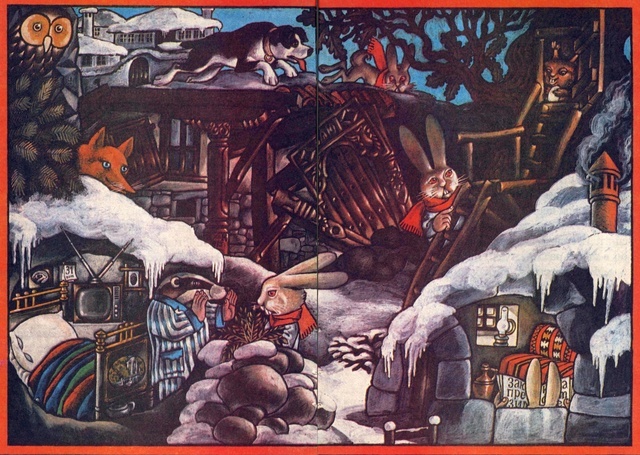 Пришла зима, выпал снег. Всё кругом побелело. Остался Заяц без крова над головой. Под колючим кустом в чистом поле лежит, от холода дрожит и думает: