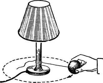 Во время передвижения мячика вокруг лампы нитка будет наматываться на мячик. Чтобы она с мячика не соскользнула, придерживайте ее рукой. Когда будет сделан вокруг лампы один оборот, нитка обовьет мячик тоже на один оборот. Как видите, мячик, сделав один оборот вокруг лампы, сделал и один оборот вокруг своей оси.