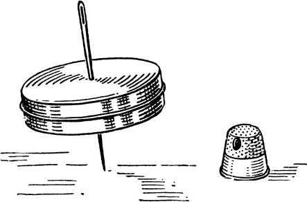 Нужно приобрести металлический наперсток и просверлить в нем сбоку отверстие диаметром пять миллиметров. Возьмите суровую нитку, вставьте ее в ушко иголки и обмотайте ею несколько раз иголку. Пропустите свободный конец нитки изнутри наперстка через просверленное отверстие. Поставьте иголку острием на твердую, но не скользкую поверхность, наденьте сверху на иголку наперсток и, нажимая наперстком на иголку левой рукой, правой рукой потяните за нитку. Когда волчок будет запущен, отнимите наперсток и наблюдайте за вращением волчка. Волчок долго будет вращаться на острие оси-иголки.