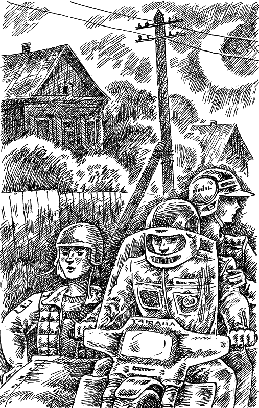 Они двинулись обратно. Дошли до автомата. И вдруг впереди увидели молодого человека, который выкатывал из ворот дома мотоцикл с коляской. Вероятно, он не хотел будить соседей ревом мотора.