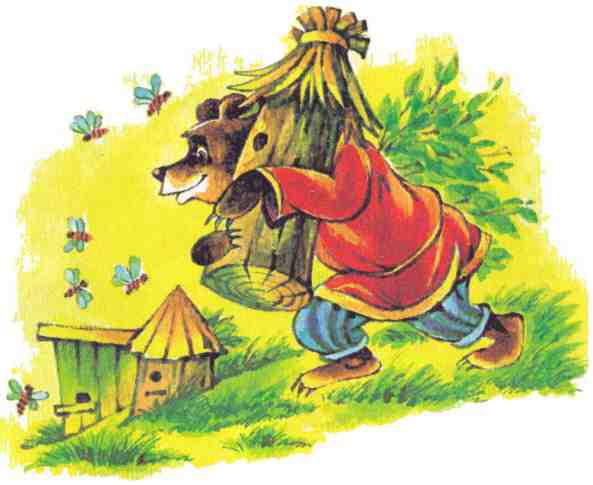 С пасеки медведь шёл, мёд в миске нёс. Увидел зайца, обрадовался: