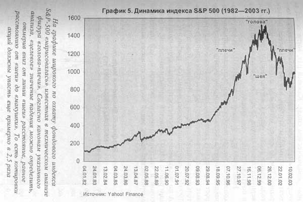 К первой половине октября 2002 года по сравнению с абсолютными максимумами, достигнутыми в начале 2000 года, падение индексов составило: Dow Jones Industrial — 37,5 %, S&P-500 — около 50 %, NASDAQ Composite — 78 %. На многолетнем графике динамики индекса S&P-500 отчетливо оформилась самая известная разворотная фигура — «голова-плечи» (head and shoulders) (график 5). В соответствии с канонами технического анализа, целевая точка падения расположена ниже уровня «шеи» на величину, равную расстоянию между линией «шеи» и «макушкой». Простые расчеты показывают, что исходя из этих формальных предположений, значение индекса должно упасть еще в 2,5 раза по сравнению с нынешним уровнем.