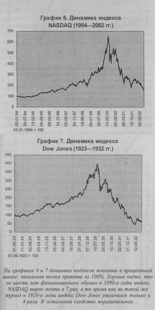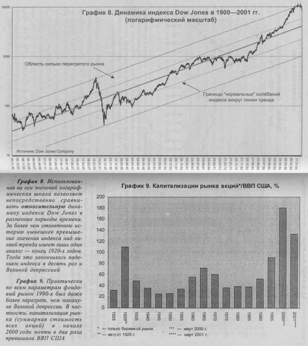 Нынешний крах фондового рынка США абсолютно закономерен, так как он обусловлен эксцессами предшествовавшего периода роста. По абсолютным масштабам прироста сравнивать динамику индекса Dow Jones за различные периоды невозможно. Однако если сравнить относительные масштабы роста, то периоды бумов 1920-х и 1990-х гг. совершенно сопоставимы (см. графики 6,7 и 8). А по показателям перегретости (отношение капитализации рынка к ВВП, к чистой прибыли компаний, к балансовой и чистой стоимости активов и т. д.) нынешний американский рынок акций вообще не имеет аналогов в собственной истории (график 9). Причем это касается абсолютно всех сегментов и секторов фондового рынка.